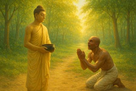 Dopo un lungo cammino, arrivò nei pressi della foresta dove si trovava il Buddha con i suoi monaci. Ma quando chiese di vederlo, gli fu detto che in quel momento il Buddha era uscito per la questua, cioè per la raccolta del cibo quotidiano.